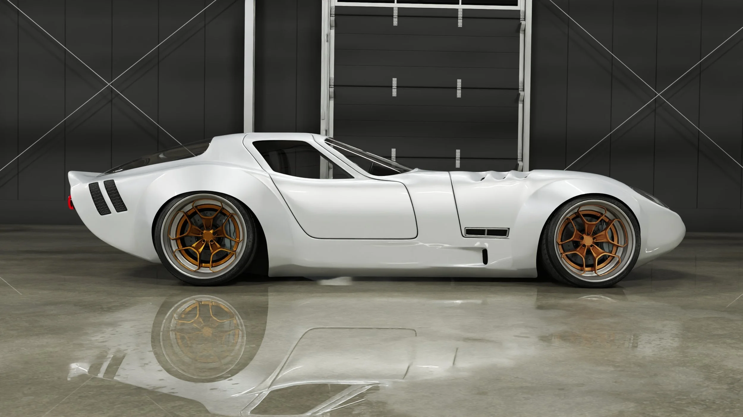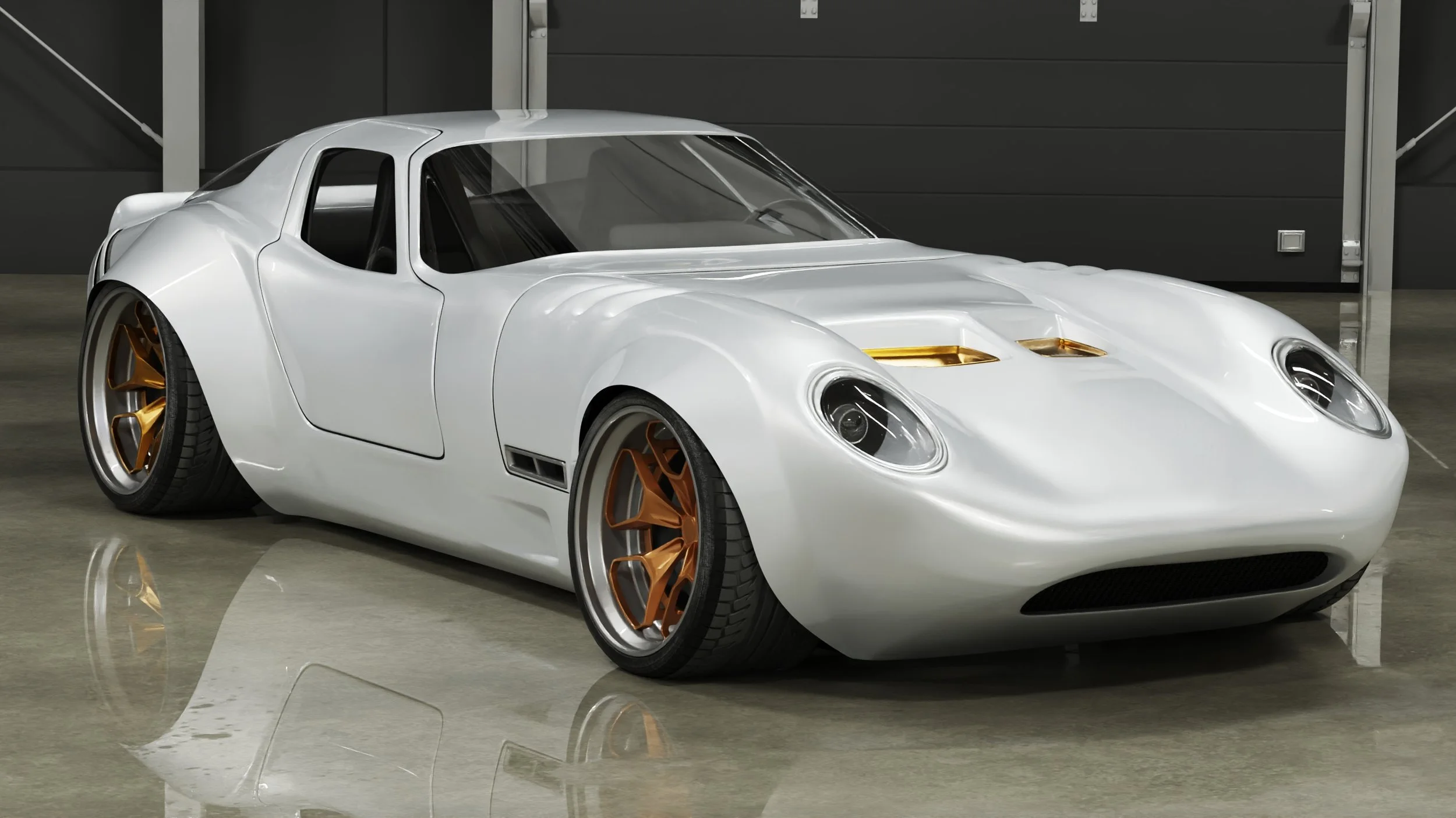 The white renderings show the finished intent: a smooth, sculpted body with purposeful aero details and an unmistakable stance. The black car is the real thing in progress—hands-on, imperfect, honest, and becoming.